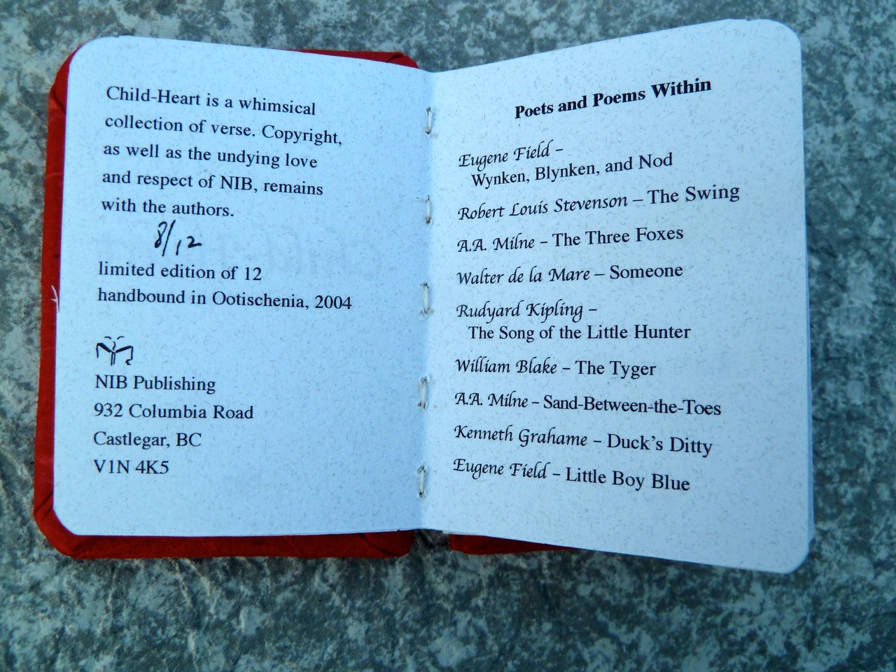 “In 2004 I was commissioned to make a book for someone who was exhibiting a doll in a show and wanted the doll to be holding a book. The project evolved into something special when I asked her if she wanted anything on the book’s pages. “Oh, I was just going to pencil in a poem,” she said. I offered to take it a little further, putting in several of the poems I loved as a child. Child-Heart was the result.”
